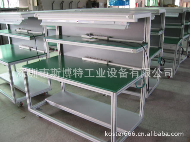 深圳工作台专业生产商斯博特有限公司设计的工作台分为轻型工作台、中型工作台和重型工作台,坚固的工作桌框架,可使工作桌承重1000kg,多种工作桌桌面选折,可配合不同的使用要求,桌脚上预留安装孔,方便客户安装电源插座,加装工具柜后,更能合理的利用空间,存放保护工具,可直接在工作桌上加装台钳,工作桌可加装百业挂板、灯具等附件,具有多种选择,满足客户要求;桌面配置有:重型复合桌面(厚度:53mm),轻型复合桌面(30mm),重型防火板桌面(52mm),轻型防火板桌面(27mm),榉木桌面(48mm),层压板桌面(50mm),铁板合成桌面(49mm),不锈钢包面桌面(52mm),铁板包面桌面(52mm);基本配置:可在桌体下吊置一个工具柜,可加脚轮,可移动,可配置工具柜等。