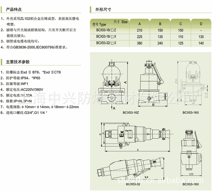 上海中兴防爆器材有限公司系中国防爆协会常务理事单位,新厂房坐落于上海南汇区六灶镇鹿园工业区鹿溪路,能生产180余个 系列、1000多个规格型号的防爆电器产品,是目前国内最大生产规模最大、销售额最高、产品配套齐全、营销网络完善、主导防爆新潮流的专业防爆电器企业。公司技术力量雄厚,设备先进,质量保证系完善,法人治理机构健全,建立了现代企业制度,已全面实现网络信息化管理。1998年公司在国内同行业中首批通过ISO9001:1994质量体系认证,2001年又率先进行ISO9001:2000改版并通过认证,随时全方位地为顾客提供优质的售前、售中、售后服务。公司现已获近200个防爆合格证及其他相关资格证书,产品性能 优越,畅销全国,被广泛应用于航天、军工、石化、煤炭、造船、酿酒、医药、纺织、食品等行业,不仅占领国内近1/3的市场份额,还远销美国、越南、印尼、苏丹、巴勒斯坦等国家和地区。 中国加入WTO后,公司直面全球经济一体化,抓住新机遇,迎接新挑战,矢志打造世界防爆名牌。公司广泛吸收国内外先进 的防爆技术成果,引进国际一流的制造工艺和设备致力于新一代防爆电器的开发、制造。 |