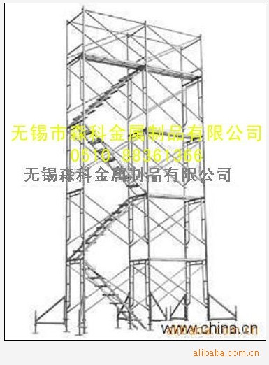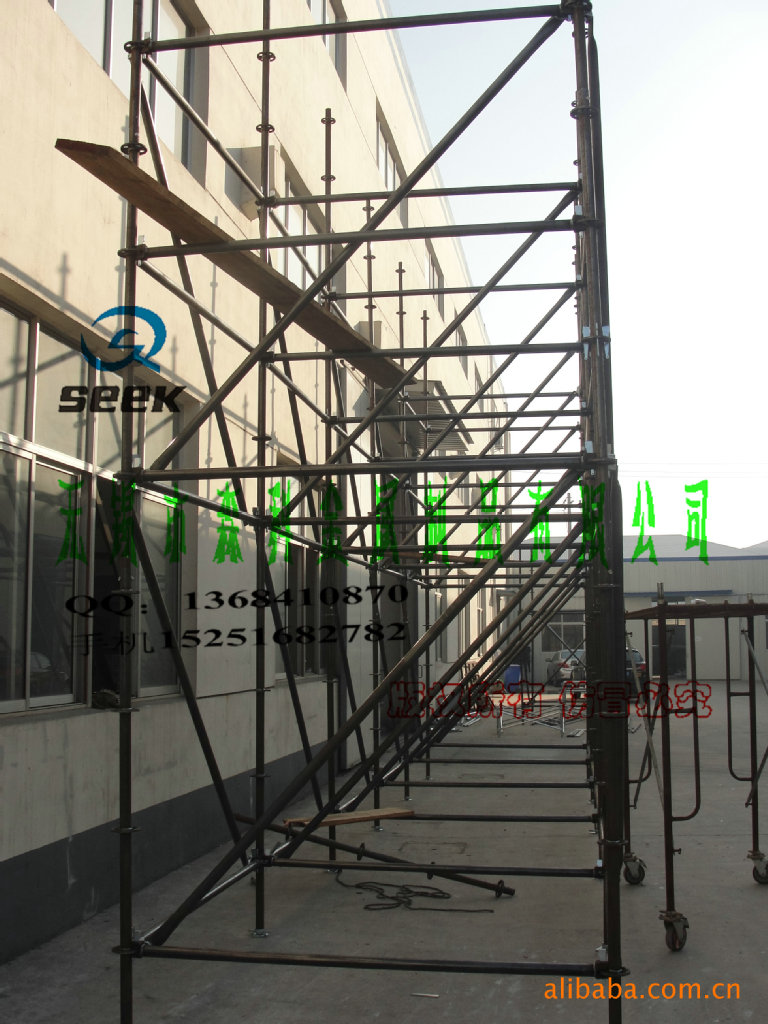 五、移动式脚手架:由门夹片,踏板,斜撑,轮子,调节底座等部分组成,使用灵活,拆装方面,广泛应用于室内外装修,外墙粉刷等各地施工场所。表面处理方式有冷镀锌(银白色)、热镀锌(银灰色)、喷塑(各种颜色)。包括917门型脚手架、梯形脚手架、双门型脚手架、908小门架,采用国标Q235钢材。