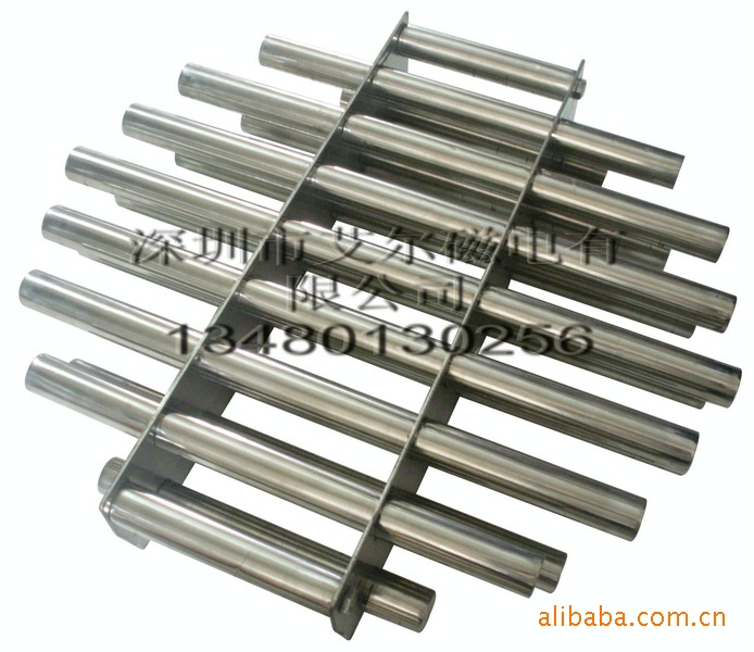 磁性过滤架是采用优质不锈钢管和高B值稀土合金钕铁硼,并采用特殊的制作方法制作而成。并将其组合在固定架上,构成磁性过滤架。当含铁的物质通过时,受到磁力棒的吸引,将含铁的物质牢固的吸附在管壁上,以保证设备的完好和产品的安全。