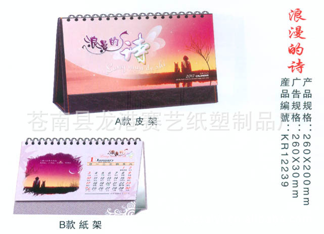 台历(又称日历,英文calendar) 是指放在桌几上的日历。现在有桌面台历和电子台历。主要品种有各种商务台历、纸架台历、水晶台历、记事台历、便签式台历、礼品台历、个性台历等。对于企业是非常有效的宣传手段,可以积累人们对其产品的兴趣和企业的知名度。适合任何企业公司,任何行业做为广告宣传、赠品之用,在其精美高端的设计中无形的增值了企业公司的形象。因此台历广泛应用于各行各业。 挂历的雏形是一种“讨债本”,随着岁月的流逝,“讨债本”逐渐演变成为当今的挂历。挂历由皇历、日历、年画逐步演变而来,是历书与年画相结合的艺术品。挂历的出版发行改变了我国传统的“历书”和“年历”记时法,过去年末岁尾,家家户户买几张年历画贴在堂屋内,一贴一年,天天都是老模样,而挂历12个月具有12张不同的画面,而且画面美观大方,月月给人一种新鲜感,客人来了往往翻一翻,欣赏一番,赞美一番,不仅使客人享受了“美”,而且也使主人心里美滋滋的,因此,挂历一上市就受到人们的喜爱。