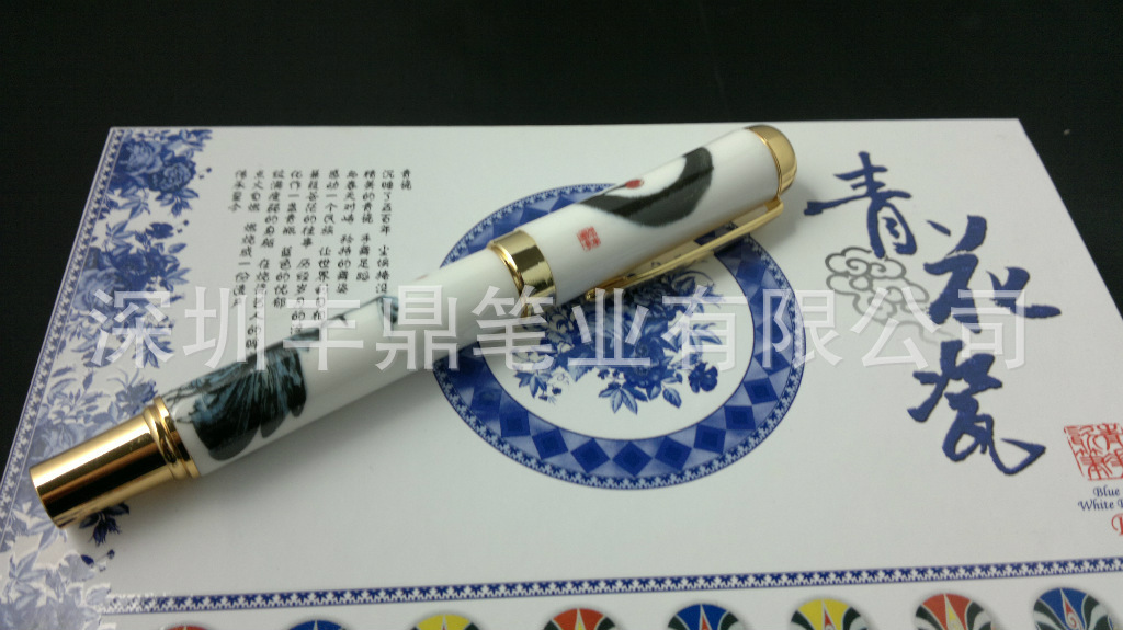 『产品工艺』:遵循古法,经过素烧、上釉、釉烧等10道工序,三进三出瓷窑以1200度的高温为您烧制出世界首款陶瓷系列礼品----笔身晶莹剔透,手感润滑。此款笔生产的难度系数极高,因为笔身的陶瓷厚度为1.3毫米,笔身和陶瓷笔杆的误差为0.05毫米,烧制温度为高温1200度,陶瓷笔管从做模,到贴花出成品时间为10道工序,出成品后经过严格筛选,一般要淘汰一半多不合格的,选出来的可谓百里挑一。由于市场上无此类产品,青花瓷笔的问世,将是礼品市场的大热门。