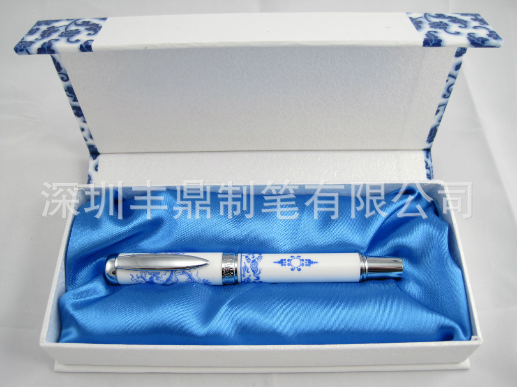 『产品工艺』:遵循古法,经过素烧、上釉、釉烧等10道工序,三进三出瓷窑以1200度的高温为您烧制出世界首款陶瓷系列礼品----笔身晶莹剔透,手感润滑。此款笔生产的难度系数极高,因为笔身的陶瓷厚度为1.3毫米,笔身和陶瓷笔杆的误差为0.05毫米,烧制温度为高温1200度,陶瓷笔管从做模,到贴花出成品时间为10道工序,出成品后经过严格筛选,一般要淘汰一半多不合格的,选出来的可谓百里挑一。由于市场上无此类产品,青花瓷笔的问世,将是礼品市场的大热门。