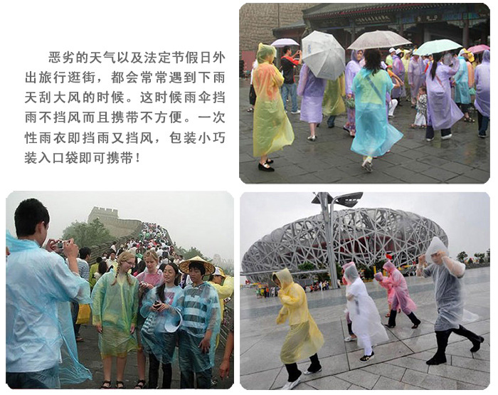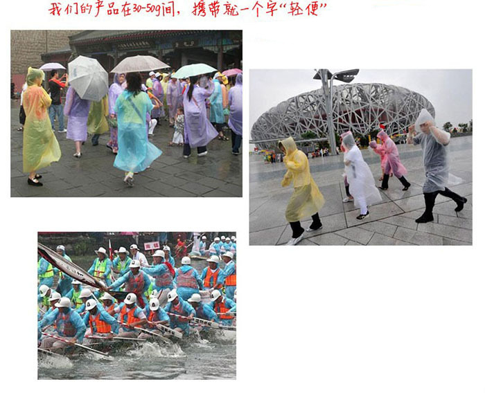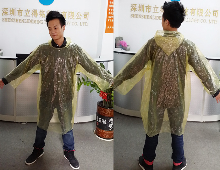 公司秉承“顾客至上,锐意进取”的经营理念,坚持“客户”的原则为广大客户提供优质的服务。欢迎惠顾! 深圳市立得铭科技有限公司成立于2005年8月,我公司生产各种塑料制品. 有现成样品,也可以根据客人来样设计生产。 合理价格,您的满意,我们的追求! 品质保证,优质服务!建议联系卖家了解详细情况,可以来电洽谈。也可以网上洽谈! 商品简介:本产品无毒无污染,适合外出旅游,观看体育赛事和室外文艺演出,户外工作、防台抗洪、随身携带极为方便 材料:PVC特殊材质-----一次性雨衣! 寒冷的冬天穿也不会变硬哦 此款为均码,适合150-180cm身高 颜色:粉色/蓝色/黄色/紫色/透明色/(随机发送) 衣长:125CM(从肩膀至下摆长度) 肩宽:65CM 胸围:68CM(平铺单面尺寸) 袖长:56CM 手工平铺测量,会有上下一点误差。 |