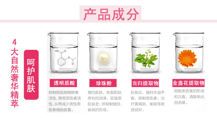 功效:选有人参,当归,珍珠,熊果苷,藏红花,白芷,