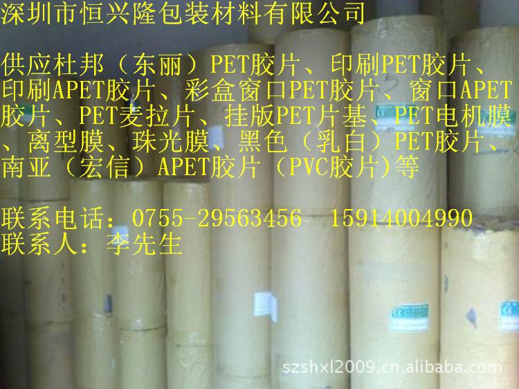 深圳市恒兴隆包装材料有限公司主要产品有:PET胶片、APET胶片、PVC胶片、PP胶片、PETG胶片、GAG胶片等、三层片、透明片、耐寒片、防雾片、防静电片、导电片、滑爽片、颜色片、等各类片材。规格:厚度:0.012-1.5MM、宽度:1-3300MM. 长度可按贵司要求分切。