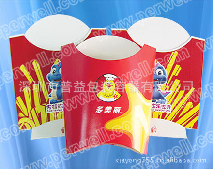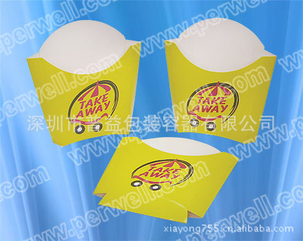 功能:该产品是西式餐饮业流行的纸餐具,是汉堡包、炸鸡块、薯条等食品的最佳纸质包装容器。