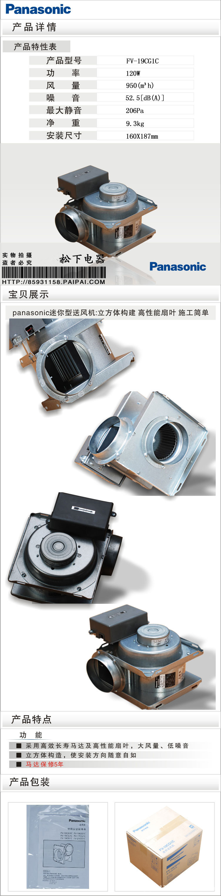 松下新风机/迷你送风机/分体管道换气扇/排气扇/排风扇/FV-19CG1C