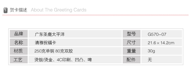 批发说明: 本店是专营批发店,店里标的价格是批发价。批发业务次订货金额需满人民币500元才给予发货。如果商品是一个系列有多款的,那么就是均款配货。不给与挑款批发。请见谅! 我司目前推出阿里巴巴网上批发及淘宝网零售平台,欢迎广大新老客户到网上、实体店来电洽谈选购! 淘宝网零售: 圣鹿官方网站: 支持混批 : 500元起批(每款款式半件起订),运送方式有快递和物流选择。具体资费联系客服修改。 =====公司介绍===== 广东圣鹿太平洋文化用品有限公司成立于1997年,是一家专业从事贺卡、相册、手挽袋、新年饰品、喜庆用品开发、生产、销售和服务的综合性企业。公司位于广州市海珠区中山大学旁的怡乐路,工厂座落在交通便利的白云区人和镇西成工业区。 作为传递祝福、留住回忆、传承文化的使者,我们十几年如一日,不遗余力地为弘扬传统文化而努力,组建了实力强大的设计精英队伍。设计的贺卡情感丰富,创意无限,风格多样,满足消费者的不同需求。公司始终坚持"设计精湛、制作精良"的宗旨,每年设计上千个品项,十二年来一直为众多大型企事业单位订做个性化礼品、赠品、促销品。同时企业产品远销世界各地。 十多年来,我们始终走可持续和国际化发展的道路,不断提高企业管理水平和发展品牌战略,公司先后通过了ISO9001:2000质量管理体系(已顺利转换为ISO9001:2008)、ISO14001:2004环境管理体系、OHSAS18001:2007职业健康安全管理体系、FSC-COC产销监管链认证;"圣鹿"品牌被中国品牌监督管理推进委员会授予"中国贺卡十大知名品牌"、"中国相册十大知名品牌"。 我们是一支"团结、正直、热情、负责"的团队!我们将竭诚为您服务,欢迎海内外各界人士与我们发展业务往来,共同创造一个"爱、和平、共赢 "的世界。
