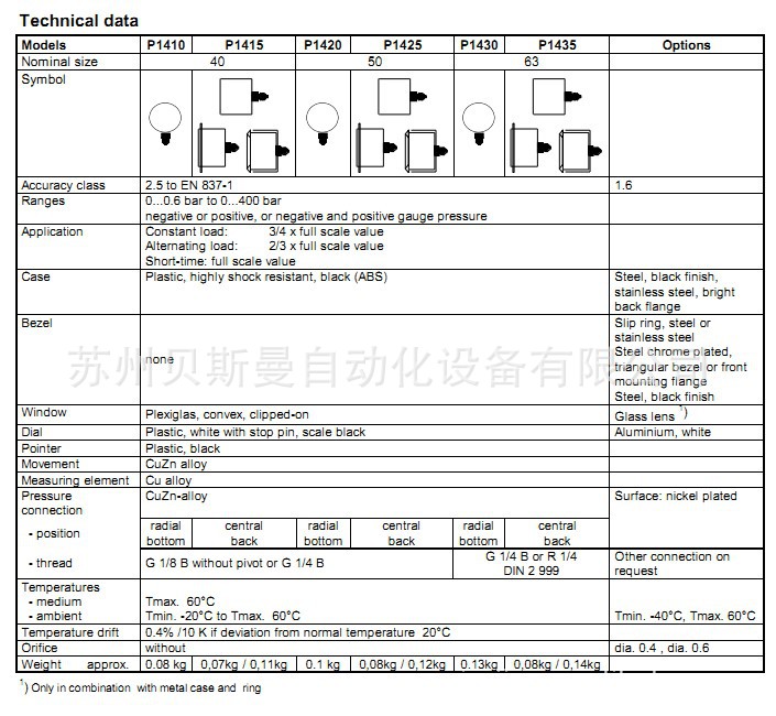 符合 EN 837-1 的标准压力表,标准尺寸表径 40, 50, 63;接口位置有底部径向。