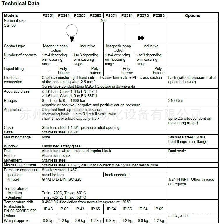 适用于化学工业的标准系统接点压力表,有或没有润滑,带有磁性吸合接点或感应警报接点,标准尺寸表径100,接口位置是底部径向或后方轴向。