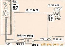 NKP-2型管道内壁喷涂器与我厂生产的无气喷涂机配套联合使用可以喷涂内径Ф250-Ф700mm的各种管道。它是利用无气喷涂机输送来的高压涂料,再经内壁喷涂器沿管道内壁旋转、移动来完成对管道内壁喷涂工作。