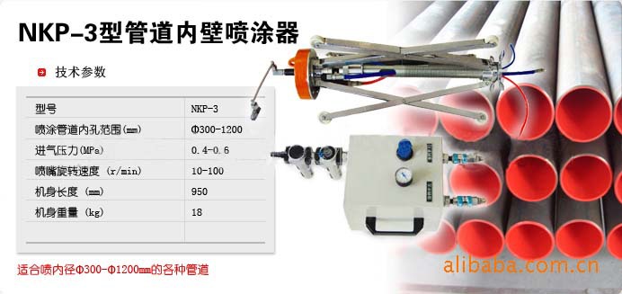 NKP-3型管道内壁喷涂器与我厂生产的无气喷涂机配套联合使用可以喷涂内径Ф300-Ф1200mm的各种管道。它是利用无气喷涂机输送来的高压涂料,再经内壁喷涂器沿管道内壁旋转、移动来完成对管道内壁喷涂工作。