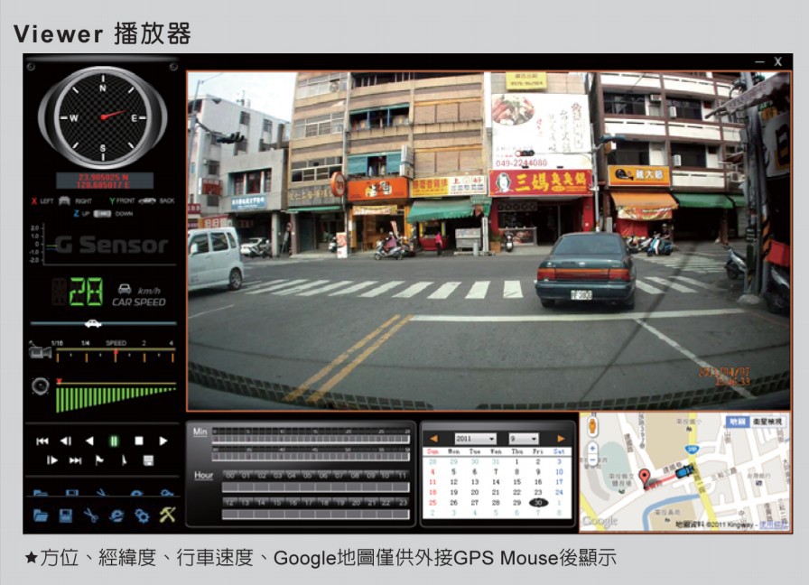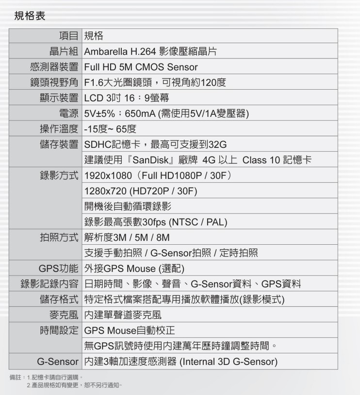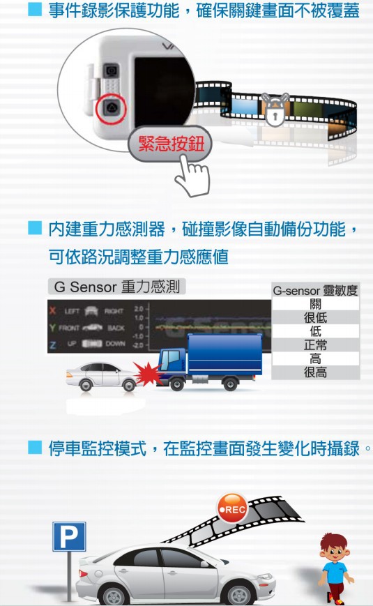 1、1080P 500万像素CMOS感测原件。镜头前方可视角度约为120度。2、适用于各种车辆,体积小 便于安装拆卸,不影像驾驶视线。3、内建3寸屏幕(16:9)便于安装调整拍摄角度,并支持手动拍照可即使回放浏览。4、回放影片或者相片时,主机内建方向感应器,可感测屏幕方向而显示正常水平。5、内建高度自动增益控制麦克风录音,可同步记录车外状况与车内声音资料。6、影像资料采用SDHC Card存储,SD卡最大支持32G7、可根据路况调整G-sensor灵敏度,冲击过大即启动强制录影,保留行车危险状况记录8、不被覆盖。9、熄火停车监控位移录影功能(需要外接电源)。