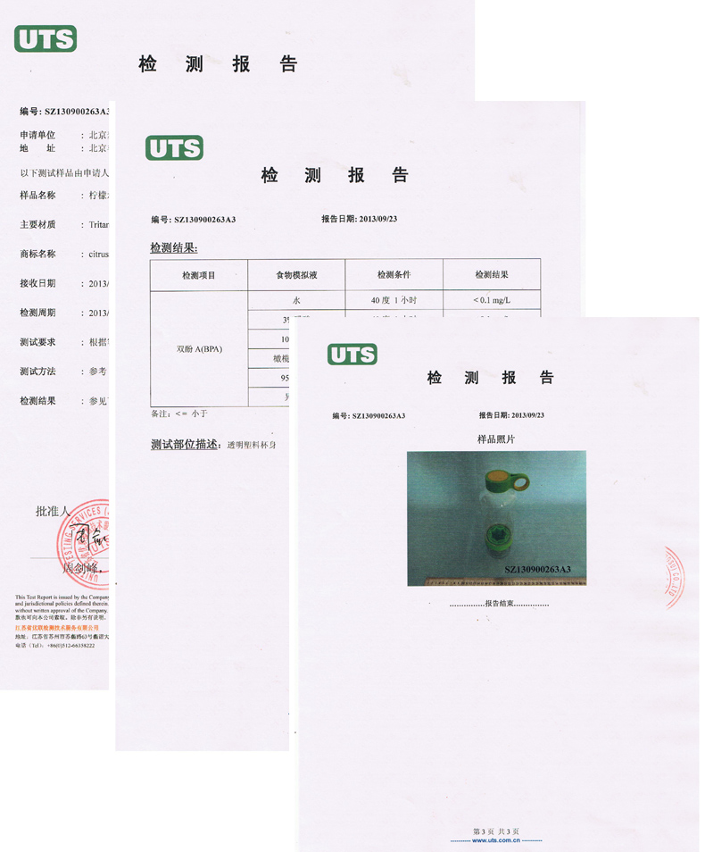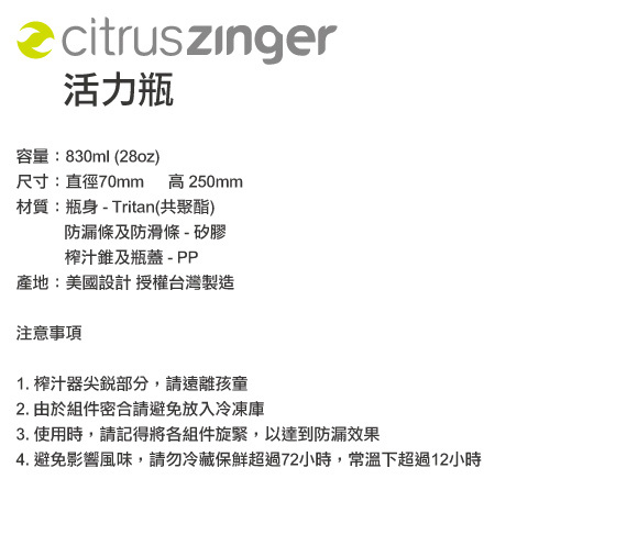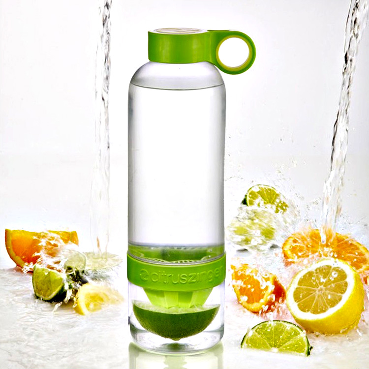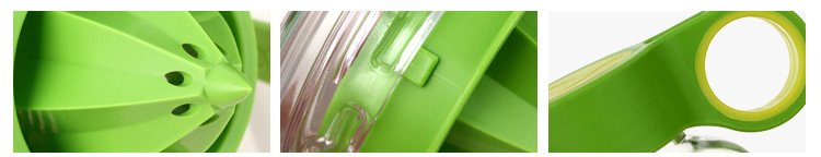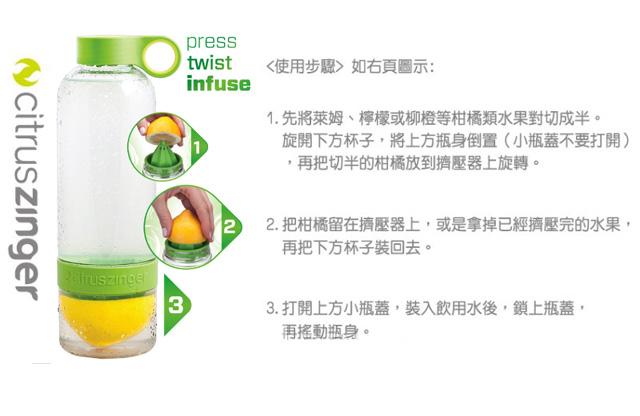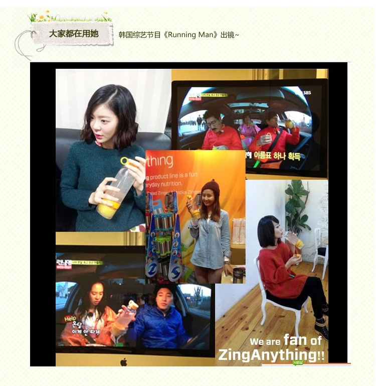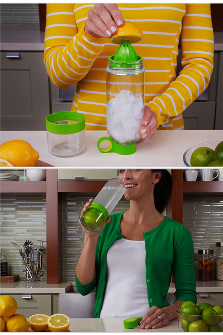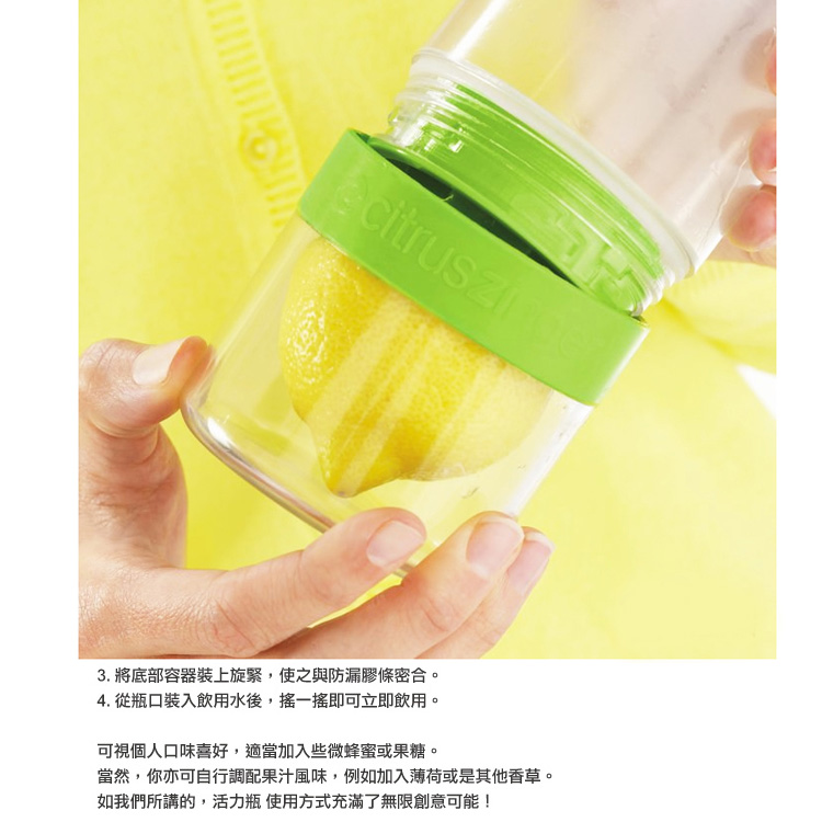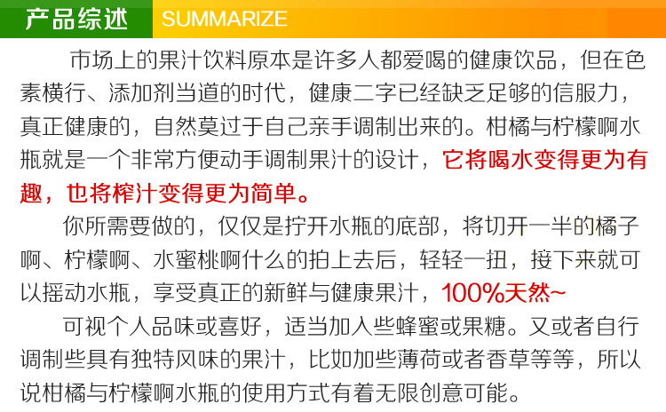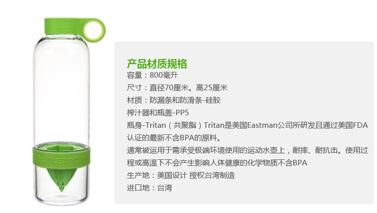 | 产品介绍 | 风靡美国韩国的活力瓶,我们先来说说它的特色: 1.操作简单,携带方便。它是一款简易的手动榨汁机,柠檬柳橙对半切开按在上面轻轻扭几下再摇一摇就OK了,可以DIY加入蜂蜜,冰块,香草等调到自己喜欢的独特口味。取下榨汁器就是一个水杯。对于OL或喜欢户外运动的人们都可以随手携带。 2.健康环保。主要是说这款水杯的材质tritan,是不含双酚A(这点非常非常重要).Tritan(共聚脂)是美国Eastman公司所研发且通过美国FDA认证的最新不含BPA的原料。市场上大多数奶瓶、水杯、水壶等都是在用PC,然而近期科学家们发现PC中含有双酚A即BPA。双酚A属低毒性化学物,科学研究证明,双酚A与癌症、糖尿病、心血管病等诸多健康问题有关,是一种内分泌干扰物质,可扰乱人体激素分泌,包括性激素。因而引起消费者对PC在食品包装产品方面安全性问题的注意和担忧。相继加拿大后我国已禁止进口含有化学物质双酚A的PC婴儿奶瓶。所以这款水杯是无毒环保的,我们喝起水来当然就很放心拉~