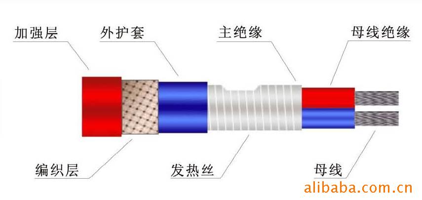 | (1)镀锡或镀镍铜芯导线(2*7/0.42)。 (2)内层发热材料,(不含氟低温PTC,含氟低、中、高温PTC导电塑料)。 (3)高密度聚乙烯、阻燃聚乙烯或氟塑料绝缘护层和加强护层。 (4)镀锡铜丝或铝合金丝编织屏蔽层。 |