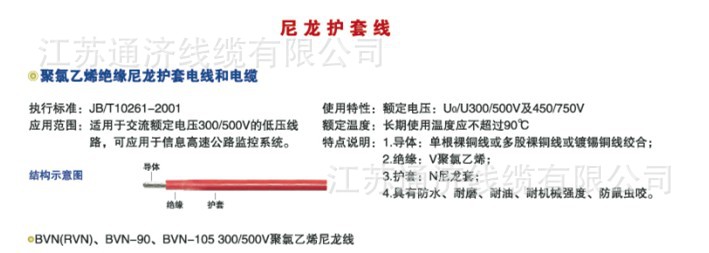 执行标准: JB/T 10261-2001《额定电压450/750V及以下聚氯乙烯绝缘尼龙护套电线和电缆》