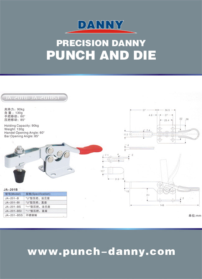 我公司生产的快速夹钳产品种类齐全,包括:水平式、垂直式、推拉式、门栓式、焊接组立式、F型、C型以及气动夹紧器等。它广泛应用于包括电子零件、通讯器材的制造,汽车、机车、自行车等钣金件及钢管的焊接装配,运动器材的生产,机械五金零件的制造,测试等,桶、槽、盖的开闭以及各种批量生产中牵涉到加工物需要固定的场合