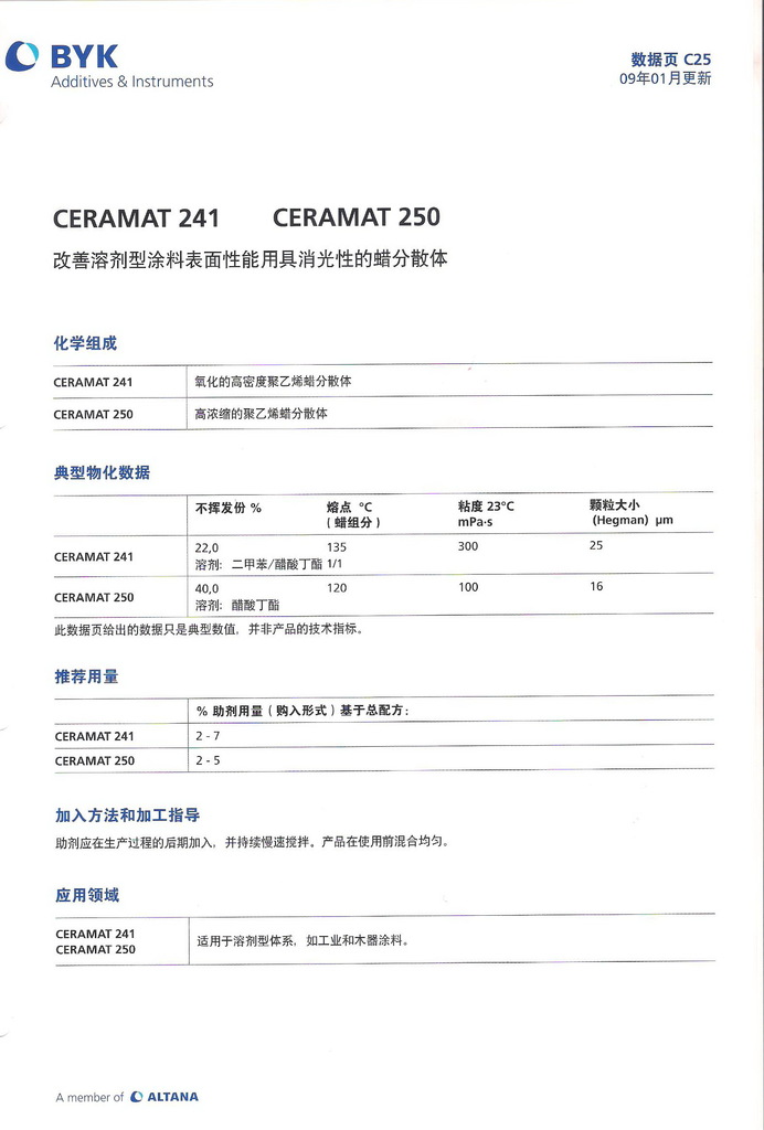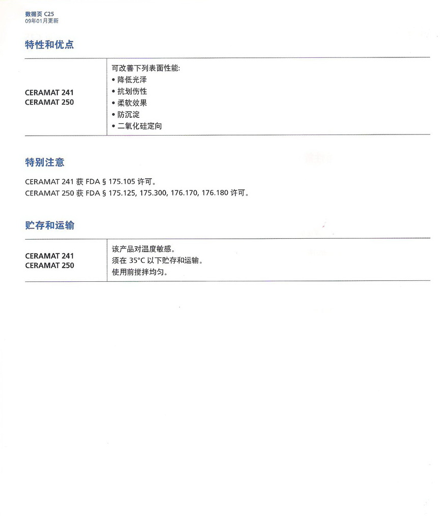 | 3 | 木器漆表面防护用消光性蜡分散液 | Ceramat 237 | Ceramat 248 |