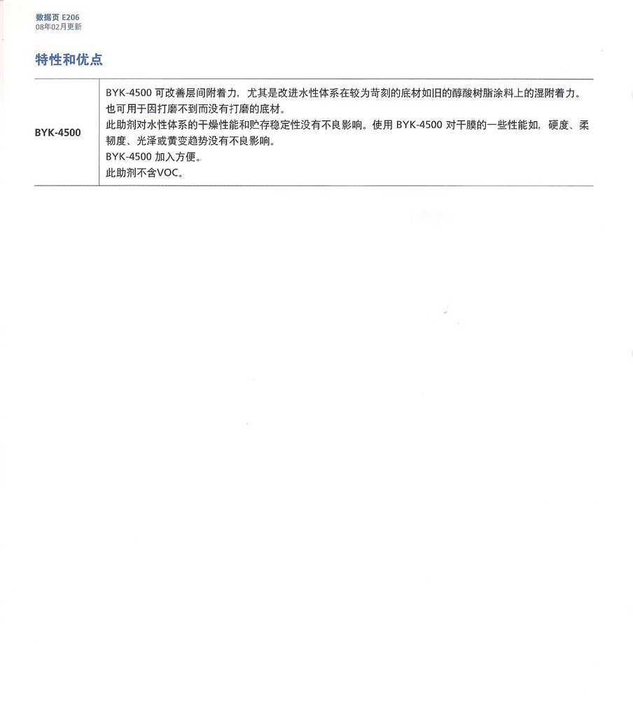 此助剂对水性体系的干燥性能和贮存稳定性没有不良影响。使用 BYK-4500 对干膜的一些性能如,硬度、柔