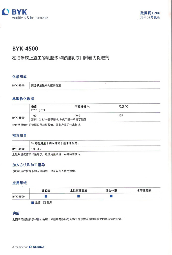 BYK-4500 可改善层间附着力,尤其是改进水性体系在较为苛刻的底材如旧的醇酸树脂涂料上的湿附着力。