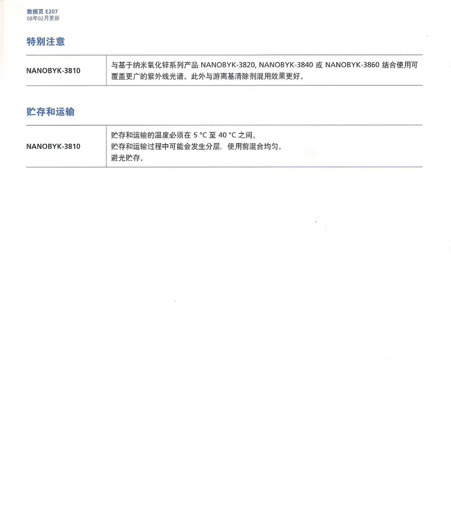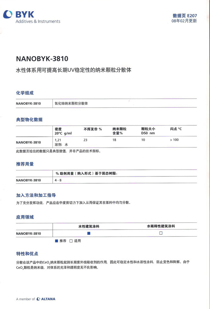 NANOBYK-3810与基于纳米氧化锌系列产品 NANOBYK-3820, NANOBYK-3840 或 NANOBYK-3860 结合使用可覆盖更广的紫外线光谱。此外与游离基清除剂混用效果更好。