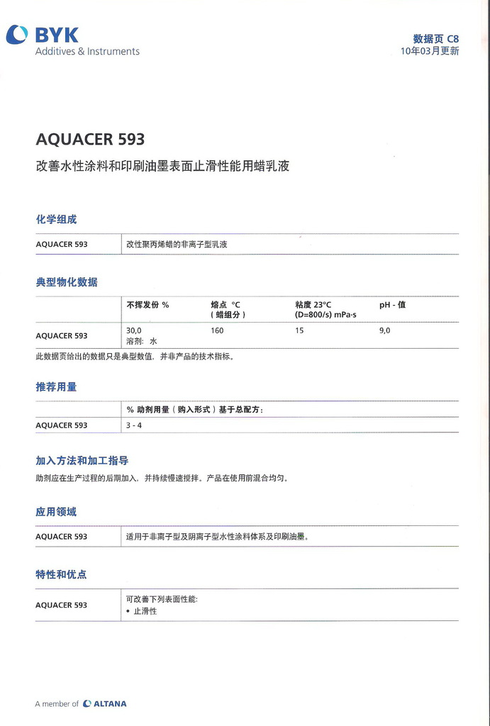 蜡乳液 德国毕克 BYK-AQUACER-593 增加水性涂料及油墨用防滑性