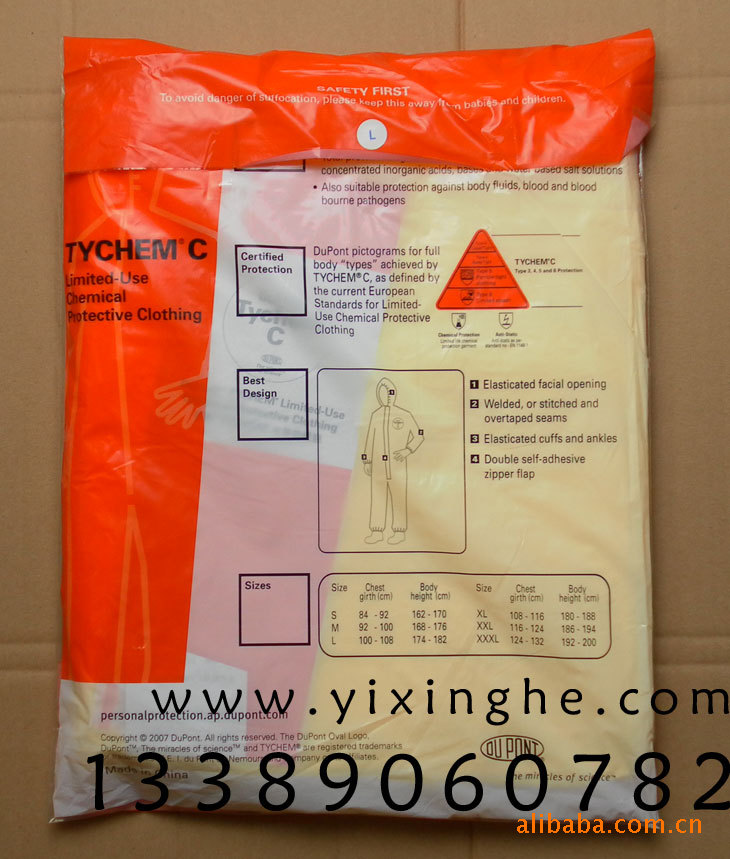TYCHEM®C已通过血液和病毒代用品的穿透测试,证明TYCHEM®C可用于防护体液、血液和血液中的病原体。TYCHEM®F的白色内表面防静电,如需防止静电积聚,就需要接地。TYCHEM®C不含有任何卤化复合物,可以焚烧或埋于专门的地方,污染的防护服应该象污染的废物一样处理,请参照国家有关法规,未污染的防护服可以回收利用。