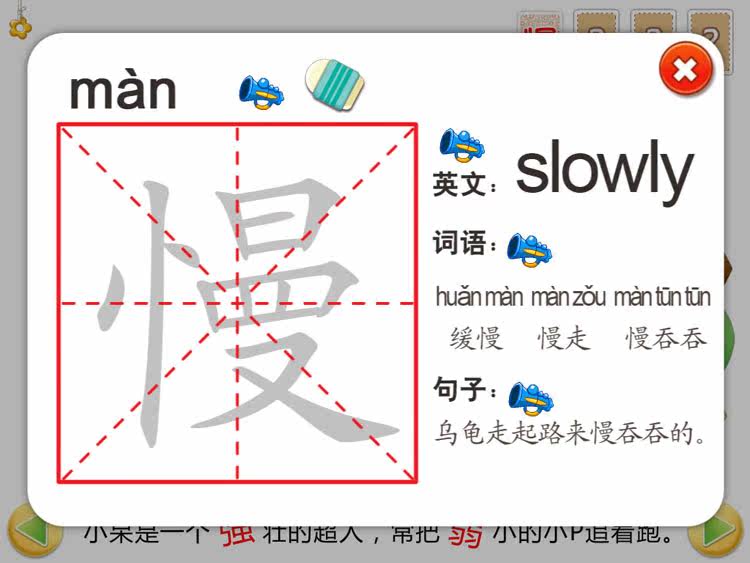 2、点击字卡,可进入相应的字卡学习界面,可进行汉字描红,并学习汉字的英文、词语、句子。