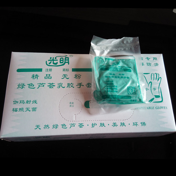 1,光明牌,绿色芦荟一次性乳胶手套(无粉)。