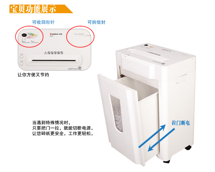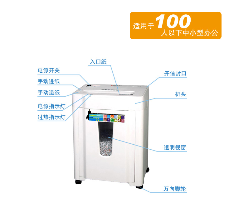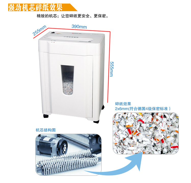 工作电流:1.0A入纸口宽度:230mm碎纸效果:2*6mm碎纸能力:6张(A4,80G)碎纸速度:2.2m/min连续碎纸时间:10min噪音:55db纸屑桶容量:19L