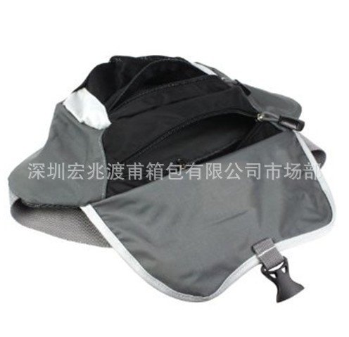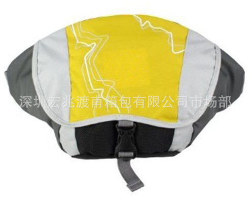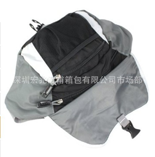 结构:拉链封口,内置拉链夹层袋一个,前置锁扣式翻盖下可见拉链口袋及网状口袋各一个。