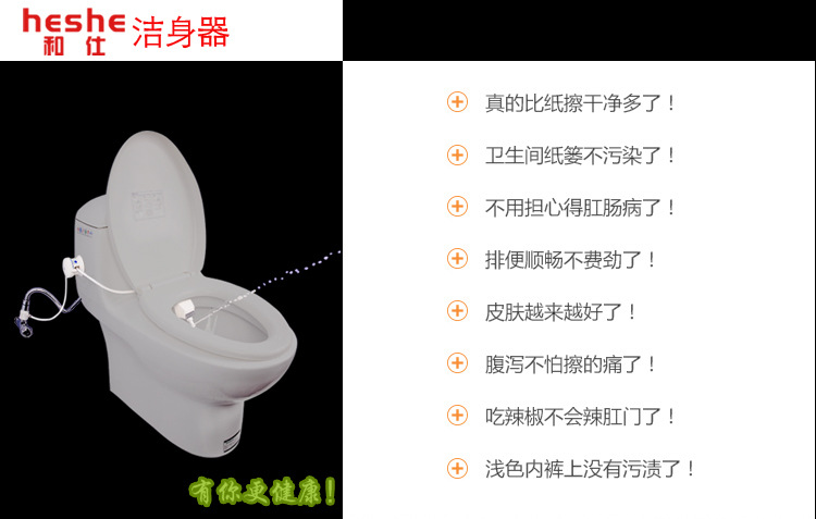 和仕洁身器, 迷你洁身器 ,不用电的洁身器, 卡式喷头,任何马桶都能用的洁身器,安装方便价格便宜,可单冷使用,也可以连接热水器淋浴花洒温水使用。没有主机,不占空间、不用电,节约能源,安全时尚又健康,女性清洗的最佳器具,痔疮、妇科病患者的福音!更有缓解便秘,低位灌肠助便的功效,家庭、高档公共场所必不可少的时尚先进的迷你洁具!专业做洁身器,独有专利产品!通过国际欧盟CE认证。淘宝有售,七天包退,十五天包换,五年超长保修期!