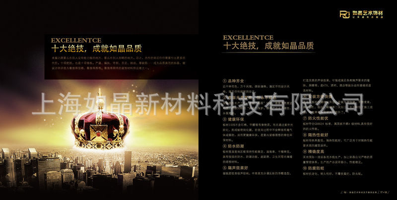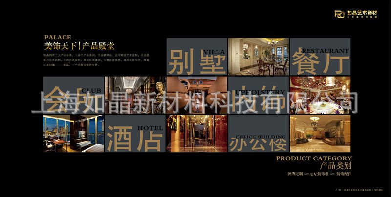 如晶艺术饰材有六大类,25分类产品,上千种花色:高光面、哑光面,透光面(呈乳白色,半透明)、缎光膜、鲸皮面(有优异的吸音性能)、金属面等。