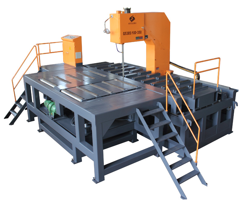 型号/名称 G5385/100-350大型立式带锯床 锯切能力 高度850×喉深1000×行程3500 锯条线速度 10-80变频无级调速 工作夹紧方式 手动装夹 带锯规格 1.3×54 主电机功率 11KW 油泵电机功率 3.75KW 包装尺寸 主要特点 G5385/100-350大型立式带锯床 进给导向采用双线性导轨及滚珠丝杆,导向精度高,摩擦系数小,使用寿命长 工件进给采用变频器无极调速,进给平稳 配备自动送料台,料台可根据需要升降,方便送料。 合理的工作台设计,方便更换锯条 主要用于锯切模坯,板坯等中厚以上钢材,具有据口窄,省料,节能,锯切精度高,操作方便,生产效率高等优点
