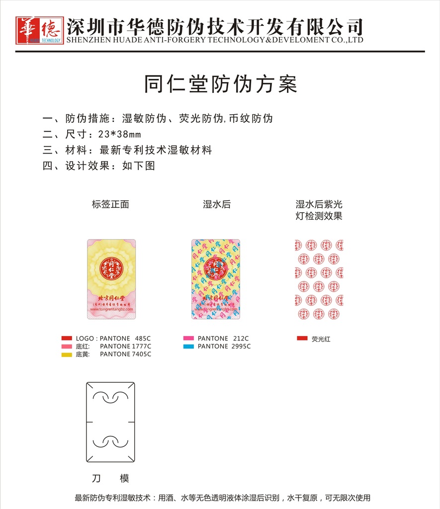 同仁堂高档中草药采用我公司独有湿敏技术作为产品封口贴标,此标签遇水即显示满版彩纹,鉴别方式简单易懂。此技术适用药品防伪、保健品防伪、化妆品防伪等,我公司专业策划团队将量身定制品牌防伪解决方案,保护您的产品不受假货侵害。