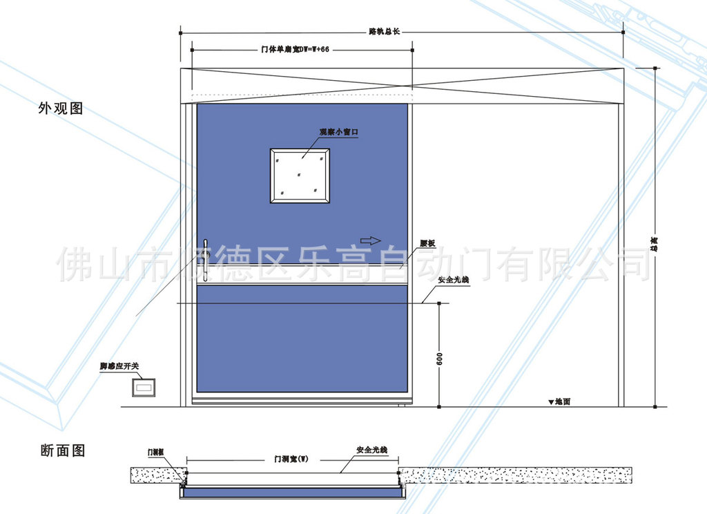 铝型材门框,铝型材盖板,门体,门机,脚感开关1对,安全光线1对,透视窗1个,拉手1对