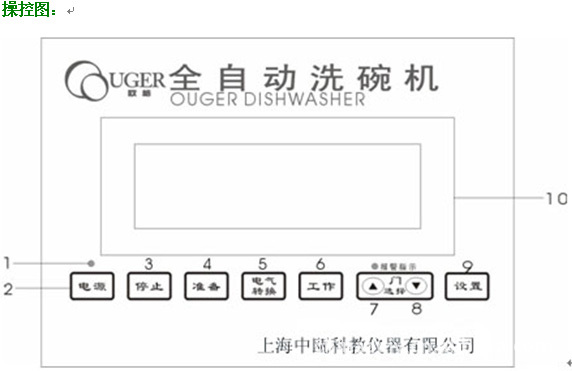 6)工作键:在水温加热到设定的最高温度后,要进行洗涤时,先按此键,再将筐放往入口,机器可进入工作状态。