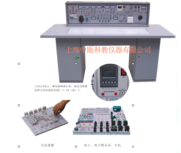 该设备是电工、电子、电力拖动三门课程综合实验设备,可完成电工学、电工原理、电子技术、电力拖动控制线路等课程近400项实验。所有的元器件均已装在元件盒上(内),元件盒盒体透明,盒内元件一目了然,非常直观。元件盒盖印有永不褪色的元件符号,符号线条美观、清晰,盒盖与盒体的结构采用较科学的压卡式结构,维修拆装非常方便。实验台桌中央配置通用电路板(注塑而成)。尺寸为90×5cm,表面均布有九孔一组互相通电插孔。元件盒在其上拼插成实验电路,具有使用方便、灵活、插拔自如等特点。所有带电部位均隐蔽,实验安全可靠,局部跨线由插块来实现,连成的实验电路直观、清楚。元器件放置在实验桌下面左右抽屉内,大大提高了管理水平,规划化程度,大大减轻了教师实验准备工作。三套设备合为一体,有效地提高实验室的利用率和经济效益。