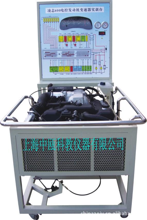 本发动机实训台是本公司采用凌志LS400(雷克萨斯)V8发动机为适应汽车教学需求而研制的,该实训台由电控发动机.自动变速器、操作显示面板及发动机彩色原理图电脑控制柜、可移动式台架(万向脚轮)、汽油供给系统(脚踏式油门踏板)、冷却系统(自动电子风扇)、启动系统、发电系统、排放系统、发动机传感、器执行器、原车仪表、原车电脑、具有发动机运转及显示(水温.燃油.机油.充电.转速.车速)配备原车DOC1接口、真空显示表、燃油压力显示表、喷油器工作指示LED灯、自动变速器电磁阀工作指示LED灯、电压检测表(检测任意路传感器工作信号、工作电压)、故障设置区可设置32路故障(老师设置任一路线路故障)、故障排除区(学生通过各种仪器、仪表、或读取故障码)在面板上用专用排故线连接排除故障、通过DLC1吊码. 故障分析、传感器信号模拟等多项功能、具结构紧凑、操作方便、安全可靠、教学直观、是汽车发动机实物教学不可缺少的实验室设备之一。