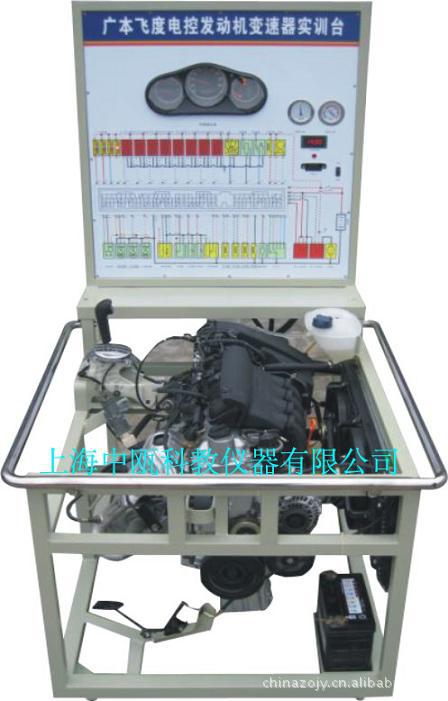 本发动机实训台是本公司采用广本飞度发动机为适应汽车教学需求而研制的,该实训台由电控发动机、操作显示面板及发动机彩色原理图电脑控制柜、可移动式台架(万向脚轮)、汽油供给系统(脚踏式油门踏板)、冷却系统(自动电子风扇)、启动系统、发电系统、排放系统、发动机传感、器执行器、原车仪表、原车电脑、具有发动机运转及显示(水温.燃油.机油.充电.转速.车速)配备原车OBD-Ⅱ接口、真空显示表、燃油压力显示表、喷油器工作指示LED灯、无极变速器电磁阀工作指示LED灯、电压检测表(检测任意路传感器工作信号、工作电压)、故障设置区可设置32路故障(老师设置任一路线路故障)、故障排除区(学生通过各种仪器、仪表、或读取故障码)在面板上用专用排故线连接排除故障、通过OBD-Ⅱ读码. 消码. 数据流. 故障分析、传感器信号模拟等多项功能、具结构紧凑、操作方便、安全可靠、教学直观、是汽车发动机实物教学不可缺少的实验室设备之一。