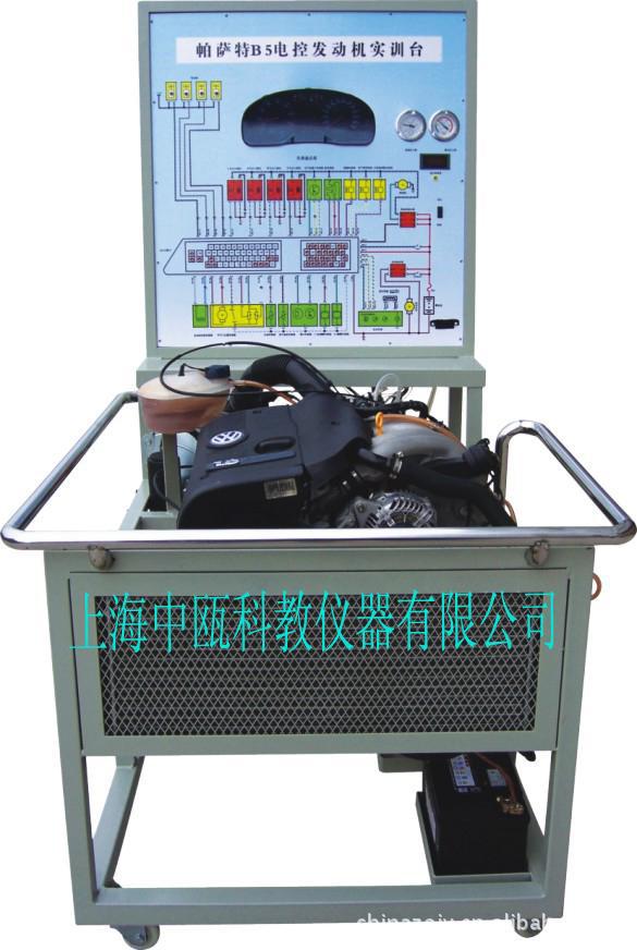 本发动机实训台是本公司采用上海大众电控发动机为适应汽车教学需求而研制的,该实训台由电控发动机、操作显示面板及发动机彩色原理图电脑控制柜、可移动式台架(万向脚轮)、汽油供给系统(脚踏式油门踏板)、冷却系统(自动电子风扇)、启动系统、发电系统、排放系统、发动机传感、器执行器、原车仪表、原车电脑、具有发动机运转及显示(水温.燃油.机油.充电.转速)配备原车OBD-Ⅱ接口、真空显示表、燃油压力显示表、喷油器工作指示LED灯、电压检测表(检测任意路传感器工作信号、工作电压)、故障设置区可设置32路故障(老师设置任一路线路故障)、故障排除区(学生通过各种仪器、仪表、或读取故障码)在面板上用专用排故线连接排除故障、通过OBD-Ⅱ读码. 消码. 数据流. 故障分析、传感器信号模拟等多项功能、具结构紧凑、操作方便、安全可靠、教学直观、是汽车发动机实物教学不可缺少的实验室设备之一。