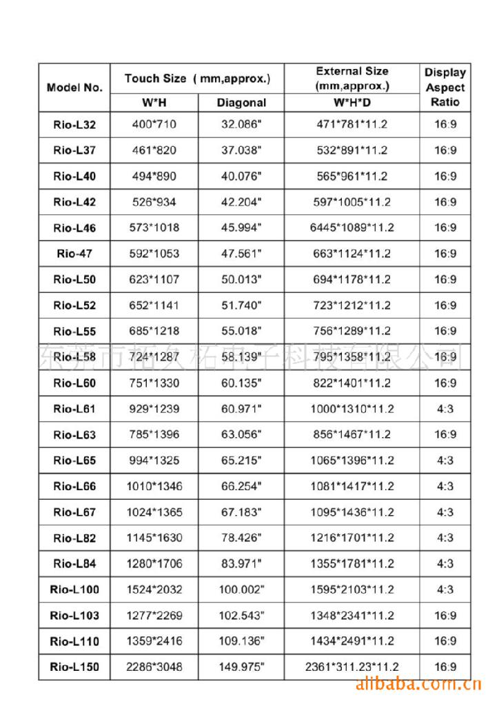 触摸尺寸:32",37",40", 42", 46", 47", 50", 52", 55", 58",60", 61", 63", 65", 84", 100", 103", 110", 150".