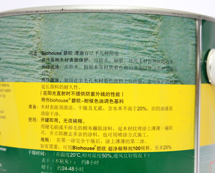 | 疑问解答: | 问:木蜡油环保吗?主要是什么原料呢? 答:绝对环保。木蜡油主要原料为精炼亚麻油、棕榈蜡等天然植物油和植物蜡并配合其他一些天然成分融合而成,所以绝对环保。亲们放心哦。 问:碧欧清油和硬质木蜡油有什么区呢? 答:①清油不含蜡,耐磨性、抗划痕性没有硬质木蜡油好。如果是用在木地板上面建议用硬质木蜡油。②硬质木蜡油符合耐冷和耐热标准,对各种冷液体如果汁咖啡等有极佳的抵抗性。 ③清油价格经济实惠,硬质木蜡油相对贵一点。 问:木蜡油和桐油以及传统油漆有什么区别呢? 答:点击查看。 |