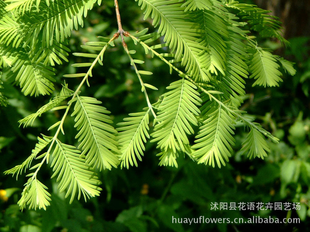 花语花卉常年批发开水杉树苗,数量大, 价格低。 订购热线:18118081999 联系人:周经理水杉简介水杉:裸子植物杉科。落叶乔木,小枝对生,下垂。叶线形,交互对生,假二列成羽状复叶状,长1-1.7厘米,下面两侧有4-8条气孔线。雌雄同株。球果下垂,近球形,微具4棱,长1.8-2.5厘米,有长柄;种鳞木质,盾形,每种鳞具5~9种子,种子扁平,周围具窄翅。水杉属在中生代白垩纪和新生代约有6~7种,过去认为早已绝灭,1941年中国植物学者在四川万县谋道溪(今称磨刀溪)首次发现这一闻名中外古老珍稀孑遗树种。据近年调查,四川万县、石柱县、湖北利川和湖南龙山、桑植均发现300余年的巨树。水杉适应性强,喜湿润生长快,北京以南各地均有栽培。材质轻软,可供建筑、板料、造纸等用;树姿优美,为庭园观赏树。水杉是“活化石”树种,是秋叶观赏树种。在园林中最适于列植,也可丛植、片植,可用于堤岸、湖滨、池畔、庭院等绿化,也可盆栽,也可成片栽植营造风景林,并适配常绿地被植物;还可栽于建筑物前或用作行道树。水杉对二氧化硫有一定的抵抗能力,是工矿区绿化的优良树种