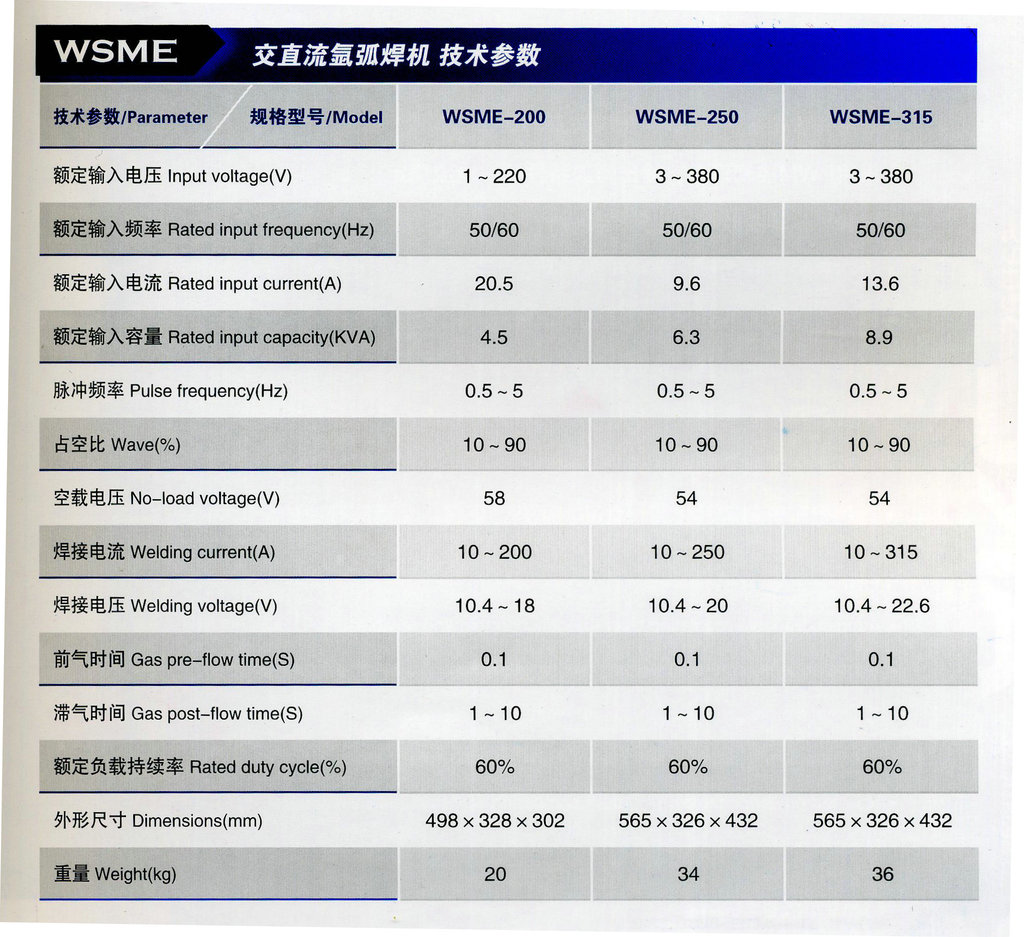 交直流氩弧焊机系列 WSME-200/WSME-250/WSME-315