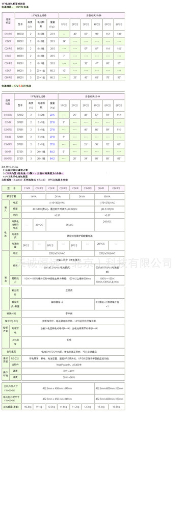 正弦波输出 无论在市电模式或电池模式,均可输出低失真度的正弦波电源,为用户的负载设备供的电源保障。 零转换时间 当市电停电或复电时,UPS在市电模式与电池模式之间的切换是完全没有转换时间的,有效保证了负载运行的可靠性。 输入零火线侦测功能 山特Rack UPS 1K~3K(S)具备零火线反接侦测功能。,避免UPS市电输入零火线反接。 旁路输出人性化 为了避免山特用户让UPS工作于BYPASS MODE不开机使用,造成市电中断,UPS与设备均异常关机。山特Rack UPS 1K~3K(S)输入正常市电,默认无旁路输出。必须开机,才会有正常逆变输出。但可以通过山特网站上的WinPower2000软件来更改配置为“上市电有旁路输出”。 TVSS功能 即TRANSIENT VOLTAGE SURGE SUPPRESS突波电压保护功能。在Rack UPS上被用于FAX、TELEPHONE、MODEM、网络等转换保护功能。 输入功因修正 Rack UPS具备输入功因修正功能,在满载情况下,输入功因可以达到0.95以上,使用户的电网环境不会受到污染。 直流启动 在市电停电状态下,若需要使用Rack UPS启动计算机或其它负载设备,Rack UPS可以直接以电池进行直流开机,使Rack UPS的使用更加方便、可靠。 旁路保护 旁路供电功能使Rack UPS的应急处理能力大大加强,同时在用户的负载设备对电源具有特殊要求时,如电压不能过高,Rack UPS提供旁路供电电压过高保护,使用户的负载设备免于高压危险。 自动启动功能 当市电异常,进入电池模式供电直到截止,Rack UPS将关机,当市电恢复正常时,Rack UPS又会自动启动开机,恢复正常供电,无需用户逐一开机。 长效型供电设计 Rack UPS全面提供长效机供用户选择。配置合适的电池组,可以使用户放电使用时间可达8小时左右,以满足不同电网环境的要求。 长效机强大充电能力 Rack UPS长效机除了放电时间延长,电池回充能力也很强,可以提供约4~9A的初始充电电流。 自我检查功能 Rack UPS可以进行模拟断电的情况,进入电池模式供电,此功能既可通过面板上的自检按键随时执行,也可以配合山特监控软件,按定期或不定期方式进行。 强力抗干扰 针对电磁干扰与射频干扰,Rack UPS依循国际标准EN50091-2和IEC61000-4系列标准设计,有效提高了UPS使用的安全性与可靠性。 可搭配发电机使用 宽广的输入电压与频率范围,使Rack UPS可以与主要品牌发电机搭配使用,使用时间更加延长,同时有效去除了发电机所产生的不良的电力,为负载提供纯净、安全、稳定的电源。 可接感性负载 Rack UPS可接感性负载(pf=0.8)。客户如有其他特殊需求,可直接接洽山特公司。 网站免费下载WinPower2000监控软件 为了使用户对UPS的管理更加便捷、有效,在山特网站上可免费下载WinPower2000网络版监控软件,实现智能化管理。 配备Intelligent Slot 智能插槽 Rack UPS配备一个Intelligent Slot智能插槽,用户可以选购山特AS400卡,以提供IBM AS400标准通讯信号,用户利用AS400界面来作Remote Display,包含声音报警及灯光显示。或选购山特WebPower智能监控卡,通过Internet国际互联网进行全球化管理,或者通过SNMP网管,实现集中监控及远程监控等功能。 配置标准电池包 Rack UPS配置了主机相同尺寸的标准电池包(供客户选择)。除要求C2KR、C3KR、C6KR标机配置一组标准电池包外,还要求C1KRS、C6KRS长效机配置2组以上标准电池包,及C2KRS、C3KRS长效机配置3组以上标准电池包。标准电池包内电池均采用高品质的原厂松下蓄电池,以良好的电池质量,保证UPS使用安全性与可靠性。 19"电池包配置时间表 |