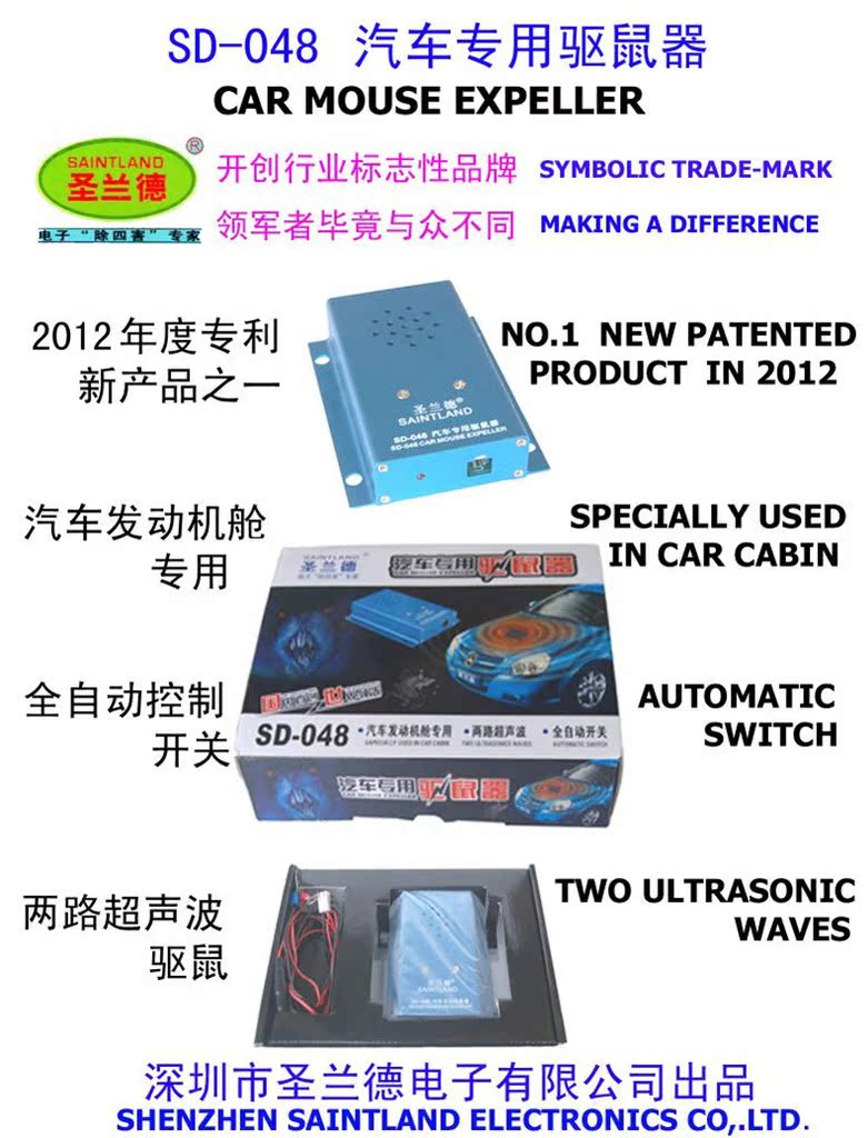 目前,各种汽车正在频频受到老鼠的侵害。老鼠经常钻进汽车的发动机舱内部,咬断电线或者油管等部件,轻者导致汽车发动失灵,重者甚至造成汽车自燃,发生意想不到的灾难。为了杜绝老鼠对于汽车的侵害,积近20年之技术经验和市场经验,本司特别推出最新产品----SD-048型汽车专用电子驱鼠器 。