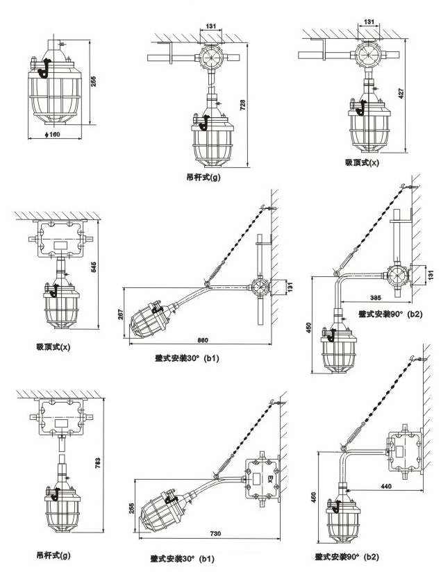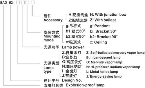按产品型号说明逐条选择,例:需配用光源为金卤灯70W、吊杆式安装配镇流器,则产品型号为BAT51-L70gZ;