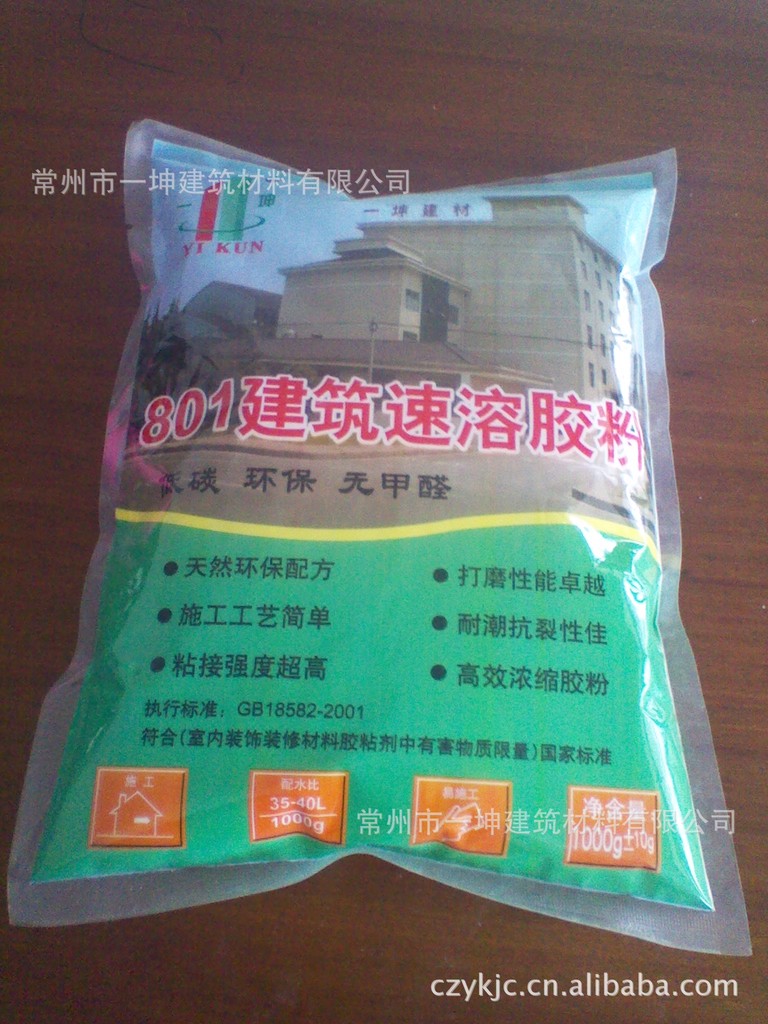 取801胶粉1袋1000克,在桶内加入冷水35-40kg,在搅拌下倒入胶粉搅拌均匀后过几分钟即成胶水。生产内墙耐水腻子,则在填料中加入20-30%的灰钙即可;普通找平腻子(821腻子)可直接与双飞粉调和使用,干擦不脱粉,易打磨。在防水丙纶的粘贴;轻质隔墙板安装嵌缝的粘结;石膏、水泥为基料的粘结砂浆粉刷中代替107,801建筑胶水使用。
